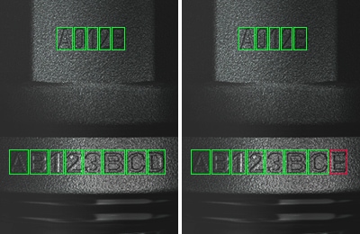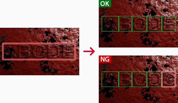 Although the purposes are different, the basic operation of character inspection is to extract characters one by one from a captured image, compare them with characters in the registered dictionary, and identify characters.
