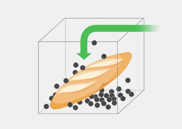The seed displacement method is often used for measuring the volume of bread, confectionery, and other food products. When measuring the volume of food products such as bread and confectionery, the products cannot be immersed in liquid. In cases like this, volume measurement is performed using small seeds instead of liquid. Besides the seed displacement method, the bead displacement method is also used to measure volume using beads as a type of pseudo-liquid. The sand displacement method using sand instead of liquid is also sometimes used to measure the volume inside large structures such as dams and tunnels.