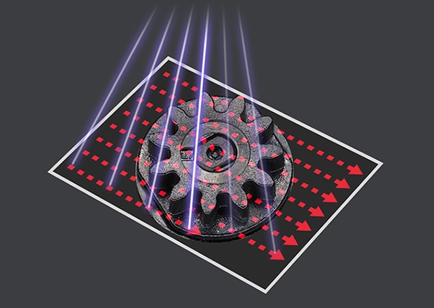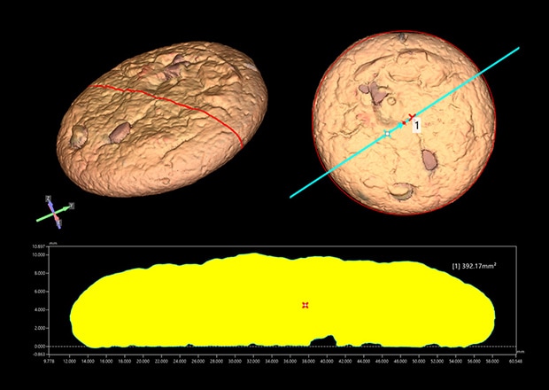Although Archimedes’ principle can be used for high-accuracy volume measurement, immersing the measurement target in liquid means the target must get wet, so it may not be suitable for all targets. A laser volumeter can be used instead for such targets. Laser volumeters use a laser beam to detect the distance to the target to scan its shape, allowing for fast, non-contact volume measurement. In addition to being fast and non-contact, measurement results can be displayed in both 2D and 3D, and the shape can be quantified using actual measurements.