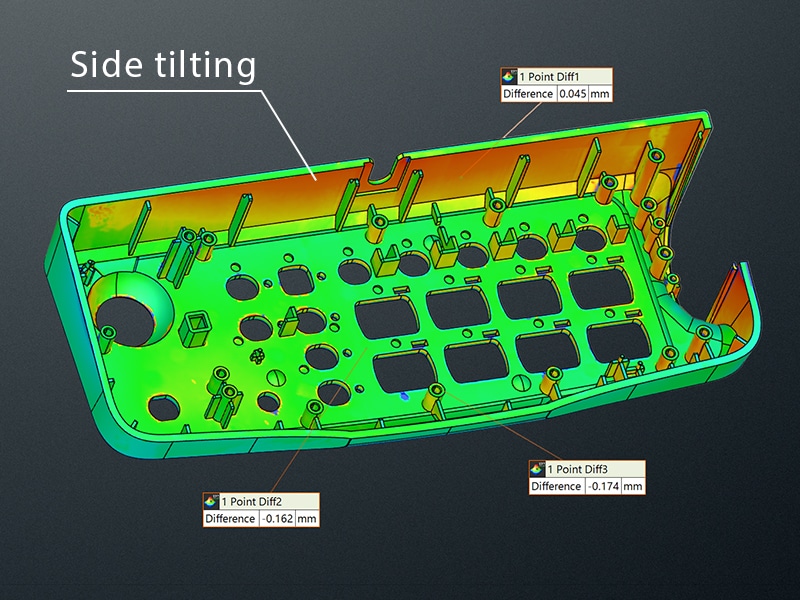 The VL Series overlays scan data from two samples, revealing differences through intuitive color mapping. When comparing parts molded under varying conditions, this visualization exposes subtle deviations such as wall tilt and thickness variations that would otherwise go undetected.