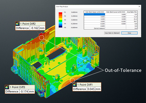 The VL Series compares scanned part data directly against 3D CAD models, visualizing deviations using a heigh-color map. This immediate visual feedback highlights exactly where the molded part diverges from design specifications.