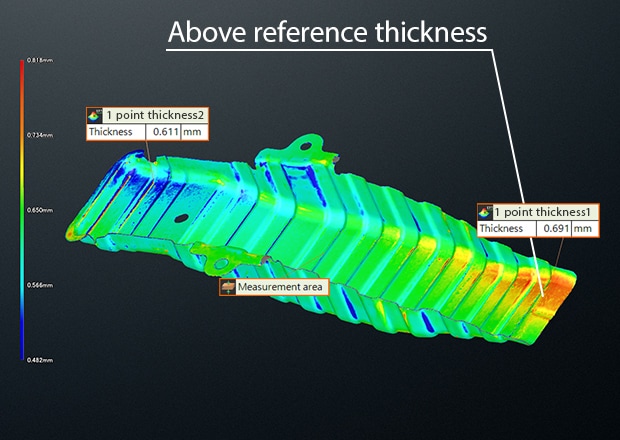 Unlike point-based methods that require mentally connecting discrete measurements to understand overall part quality, the color map provides immediate visual feedback across the entire surface. Areas requiring attention stand out immediately, enabling faster decision-making and more efficient quality control. This comprehensive surface analysis—impossible with traditional measurement approaches—allows you to evaluate thickness easily, accurately, and at a glance.