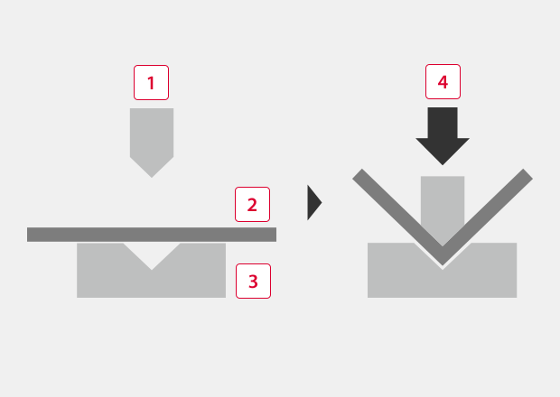 One typical process where bending radius is important is sheet metal working. A common method of sheet bending uses a “press brake” that presses the sheet between the upper die called the punch and the lower die. In addition to the V-dies shown in the figures on the right, various types of dies are used according to the bending shape and material. These include radius dies that bend the sheet in a gentle curve and U-bend dies that bend a sheet at two points simultaneously in one stroke.
