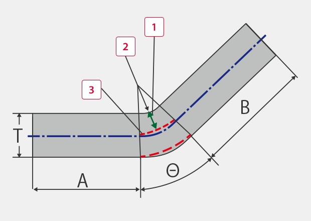 The developed bending length is required in order to allow for stable bending. It can be estimated by obtaining the distance from the bending radius surface to the neutral axis. As the straight parts A and B are not changed by bending, use the actual values.