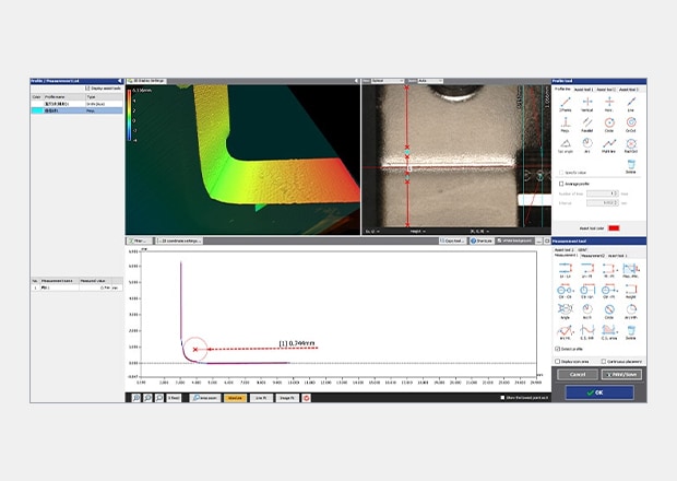 The VR-6000 Series instantaneously acquires surface data (800,000 data points in one scan) in as little as one second. It allows accurate measurement and evaluation of the maximum and minimum surface irregularities across the entire bent part. The VR-6000 Series can also measure profiles at specific locations. Even after measurement, profiles of different parts can be acquired from the 3D scan data without scanning the target again.