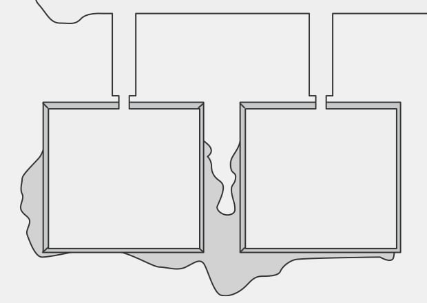 When multiple products are formed at once by injection molding, molten plastic leaking from the parting lines can join together as shown in the figure, resulting in molded products that are connected to one other via burrs even after the gates are cut.