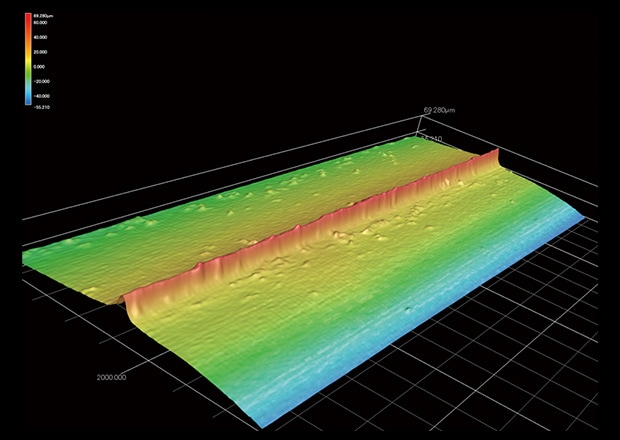 At burr inspections, it is often necessary to identify the maximum burr height. Because the location of the highest burr differs with each individual target, it is necessary to acquire data for the entire measurement area. The VR-6000 Series can measure a wide area (up to 300 × 150 mm 11.81″ × 5.91″), enabling fast and accurate burr peak measurement by a simple operation.