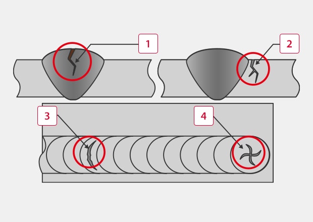 Cracking refers to cracks that form in a hot weld immediately after welding. Cracking is broadly divided into solidification cracking and liquation cracking. Solidification cracking occurs when the weld solidifies. Liquation cracking occurs in multi-layer welds when the previous welding layer is melted by subsequent welding. Depending on the location and shape, cracks are classified as longitudinal cracks, toe cracks, transverse cracks, or crater cracks.