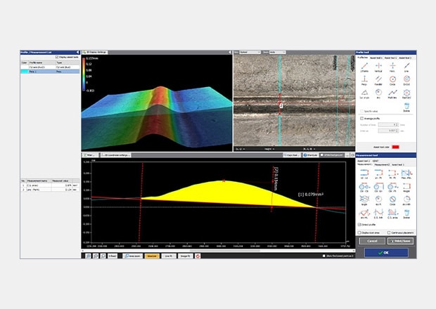 The maximum and minimum surface irregularities can be displayed in an easy-to-understand manner in a color map, making it possible to identify the locations of defects. It is also possible to acquire detailed profile data simply by specifying any desired location on the target, such as the locations of defects.