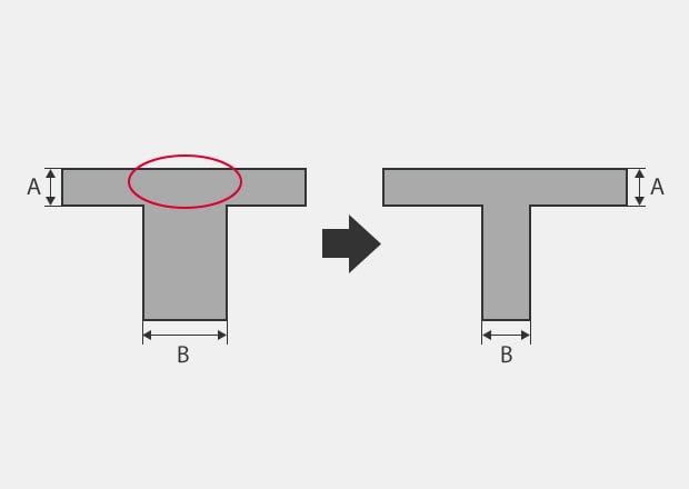 In general, the thicker parts cool more slowly than the thinner parts. Sink marks are more likely to occur at such parts (shown by the red circle in the figure on the right). In this case, it is possible to eliminate the sink mark by changing the wall thickness of the plastic molded product. For example, changing thickness B in the figure so it is the same as A (or so it is 70% or less) can prevent the occurrence of sink marks.