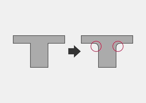 As previously stated, sink marks can be prevented by reducing thickness. However, there are some cases when the thickness cannot be changed. For example, sometimes thickness cannot be changed in order to maintain strength. In cases like this, you would want to change the shape so that wall thickness changes gradually. Looking at the example below, you can see how you can add rounded corners to resulting in a slight decrease in wall thickness.