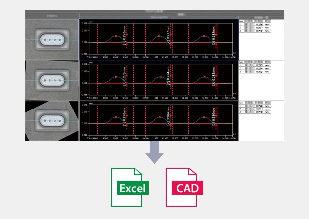 Data can be output to Excel exactly as it appears on the screen. Features such as the ability to sort each measured value, or to set a pivot table for summarizing data, make it possible to smoothly perform detailed examinations. In addition to STEP and ASCII, CAD data output in STL format is also supported. The created data can be utilized in a wide range of ways.