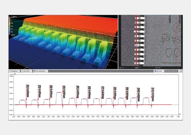 - Measurement can be completed in as little as one second. Lifting (heights) of multiple leads can be captured as a surface can be identified in the color map. Detailed data can be acquired by performing profile measurement of the desired cross-section.