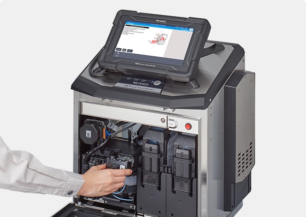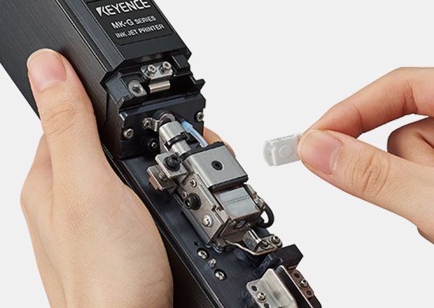 Rapid recovery from issues and errors preventing printing with one touch nozzle replacement. The nozzle is a common clogging point, so KEYENCE revolutionized the nozzle by making it cheap and easy to replace in under 1 minute. No more reliance on expensive parts and service contracts for traditional continuous inkjet printers (CIJ).