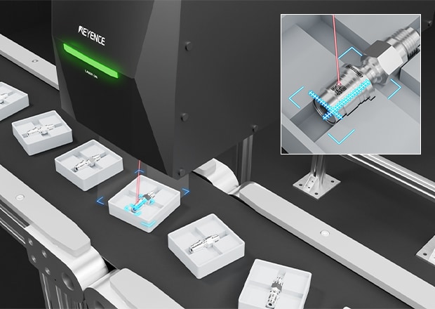 The KEYENCE MD-X and MD-U Series laser markers use built in distance sensors and 3-axis capabilities to have complete control of the marking field. Deviations in part presentation no longer lead to scrap, as depth or location changes are tracked and accounted for before each mark with only the laser.