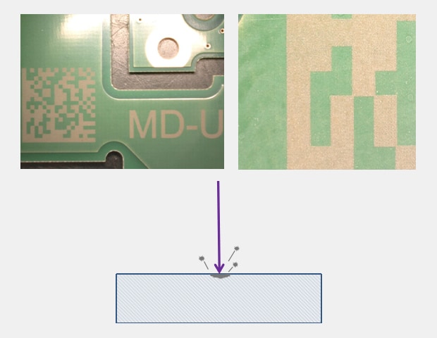 Due to its shortened 355 nm wavelength, the absorption rate of UV laser light skyrockets. This allows the MD-U to perform "cold marking" completely negating any thermal impact to the FR-4 Coating and keeping the underlying copper untouched.