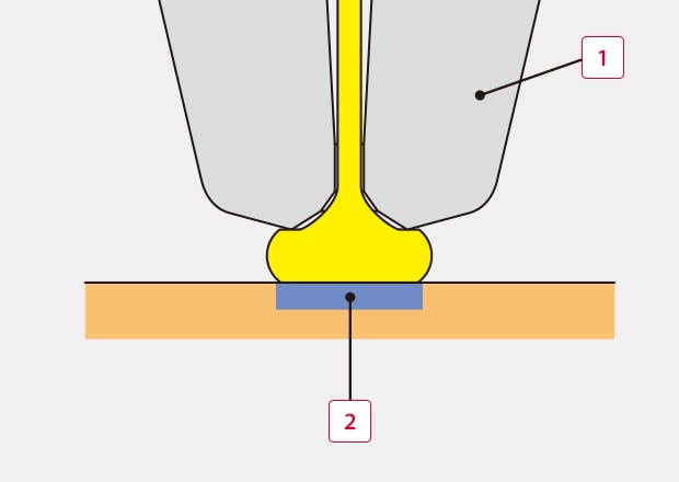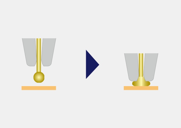 Tube shaped capillaries (like an injection needle) with metal wires running through them are used. The wire tip is sparked by high voltage to make it round. The round part is then bonded to the electrode to attach it. This is called Ball Bonding or 1st Bonding. A load from the capillary, ultrasonic waves, and heat from the bonding stage allow the bonding to take place.