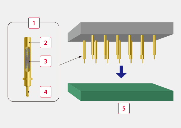 This is a jig used during inspection of various electronic components. This inspection targets a wide variety of components including semiconductors, LCD panels, raw PCBs, mounted PCBs, connectors, capacitors, and sensors.