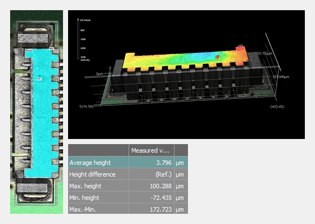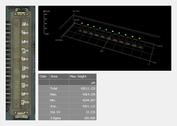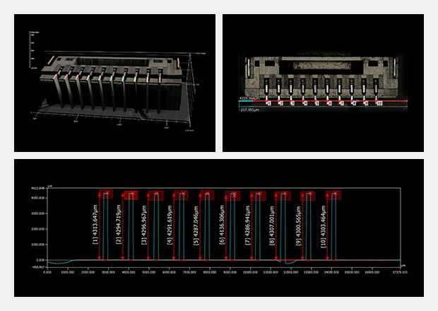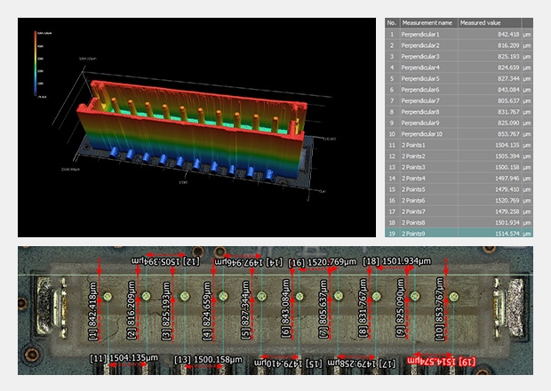 Meanwhile, connector types and applications have also increased, leading to an even greater need for product inspection and analysis. KEYENCE’s latest model in the VK-X3000 Series is capable of repeat measurements, automatic measurement of multiple locations of the same target, and creation of OK/NG analysis templates.