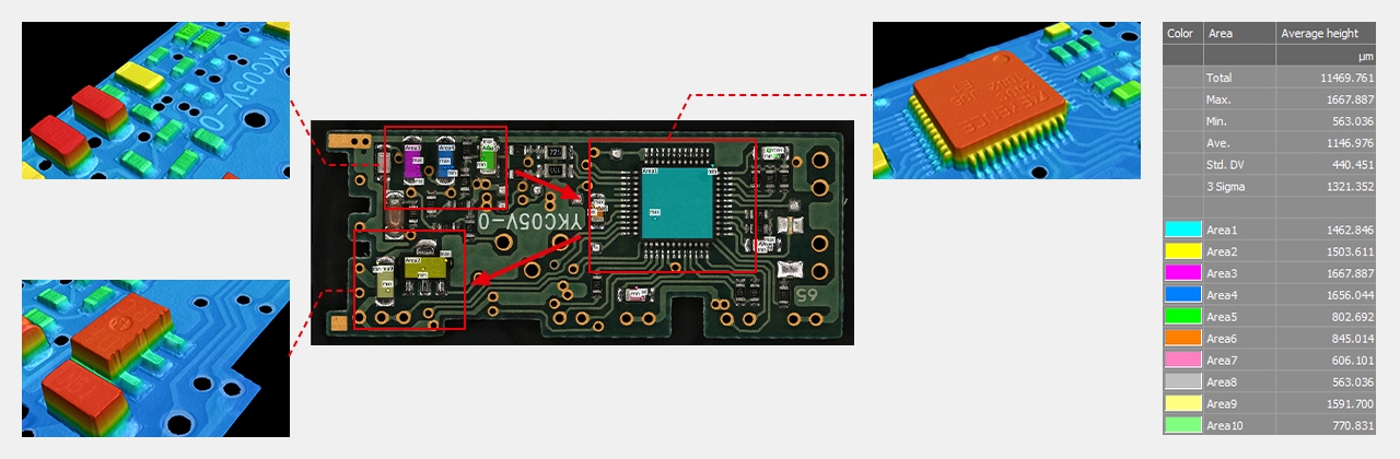 In recent years, devices such as smartphones, tablets, and wearables have become smaller, with lower profiles and higher functionality. The PCBs and other components used in these devices have also become smaller, denser, and more multilayered. This has resulted in an increased demand for more detailed product inspection and analysis. KEYENCE’s latest model of the VK-X3000 Series is capable of repeat measurements, automatic measurement of multiple locations of the same target, and creation of OK/NG analysis templates. This section introduces technical information related to PCBs and PCB-mounted components along with example inspections using 3D surface profilers.