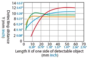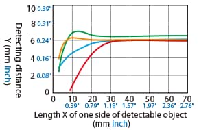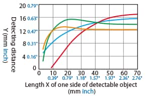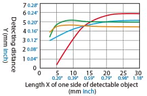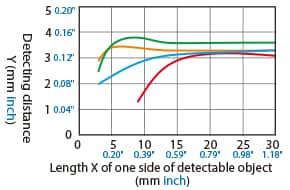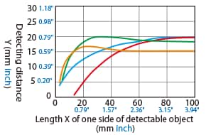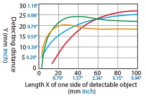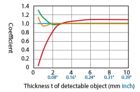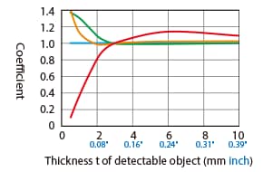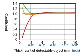 The detecting distance varies according to the detectable object material, size, and thickness. The detecting distance can be checked using a detectable object by multiplying the detecting distance Y (mm inch) in the “Variation of detecting distance according to the size and material of the detectable object” characteristic diagram by the coefficient in the following characteristic diagram.