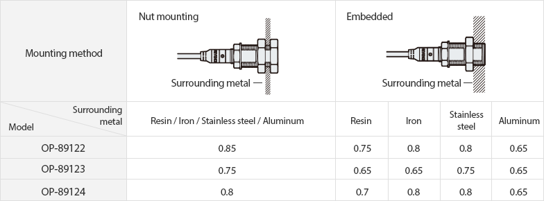 The detecting distance decreases when using the Quick-Swap Bracket. The detecting distance also changes with flush installations depending on the material of the surrounding metal. Use the following factors multiplied by the detecting distance in the specifications as a guide.