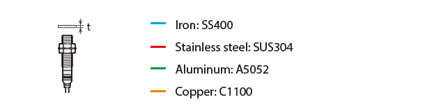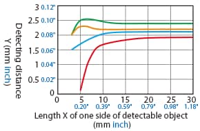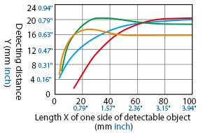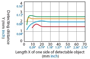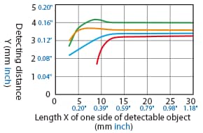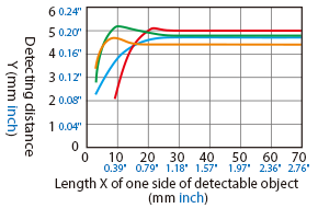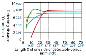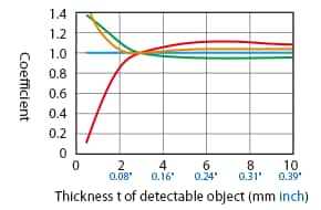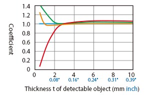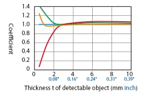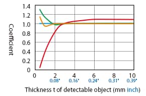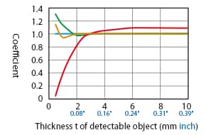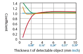 The detecting distance varies according to the detectable object material, size, and thickness. The detecting distance can be checked using a detectable object by multiplying the detecting distance Y (mm inch) in the “Variation of detecting distance according to the size and material of the detectable object” characteristic diagram by the coefficient in the following characteristic diagram.