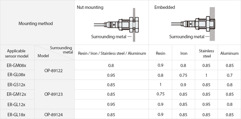 The detecting distance decreases when using the Quick-Swap Bracket. The detecting distance also changes with flush installations depending on the material of the surrounding metal. Use the following factors multiplied by the detecting distance in the specifications as a guide.