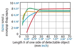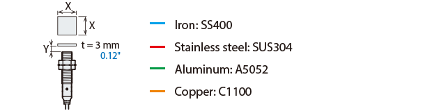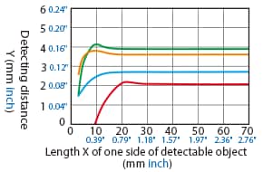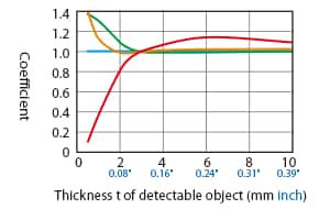 The detecting distance varies according to the detectable object material, size, and thickness. The detecting distance can be checked using a detectable object by multiplying the detecting distance Y (mm inch) in the “Variation of detecting distance according to the size and material of the detectable object” characteristic diagram by the coefficient in the following characteristic diagram.