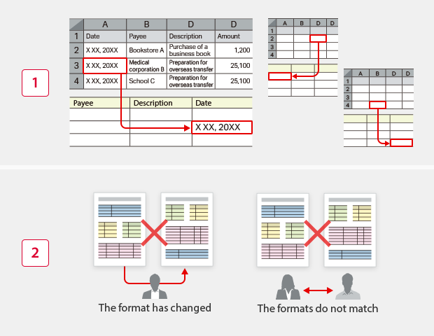 Because operations require selecting cells, errors can occur if rows or columns are added, joined cells are split up, or the cell location changes. If the formats do not match from the start, the file will need to be completely rebuilt.