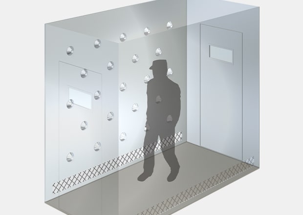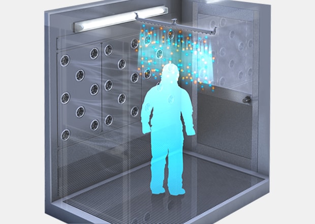 An air shower is an antechamber for removing dust or other particles that adhere to the surface of items or people before room entry. It does this by applying jets of air cleaned with HEPA filters. If clothes or dust are still charged with static electricity, the dust blown off by the air will adhere again.