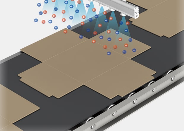 Active ionization neutralized the static charge on cardboard boxes and in the surrounding air. KEYENCE ionizers emit balanced positive and negative ions that combine with charged surfaces to bring them into a neutral state to provide targeted static control for packaging glue applications directly at sealing stations.