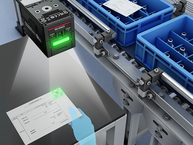 The ideal solution for this system is the KEYENCE SR-L Series, a code reader for moving objects and labels. Featuring a wide field of view and a deep focal length, it rapidly recognizes barcodes and QR codes even when an operator casually presents an instruction sheet, without needing to precisely align its position or orientation. It delivers stable reading performance even for slips under vinyl or for low-quality codes with fading or dirt, strongly supporting stable site operations. It promotes traceability management and automation in diverse fields, from automotive parts assembly and electronics picking to pharmaceutical inspection.
