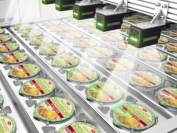 This image shows an application that uses image processing technology integrated into an FA (factory automation) system to read codes printed on the lids of cup noodles being transported in multiple rows all at once. The KEYENCE SR-L Series code reader for moving objects and labels plays a key role here. Its main feature is an ultra-wide field of view that can cover a wide area with a single unit, simplifying the reading of multi-row workpieces that previously required multiple code readers or complex mechanisms. This significantly reduces equipment installation costs and setup time. It also delivers stable reading performance on high-speed production lines, contributing to reliable quality control and productivity improvement. With built-in lighting and autofocus functions, changing settings for product changeovers is also easy, minimizing downtime. This is a solution that achieves both efficiency and cost reduction in traceability management for packaging processes.