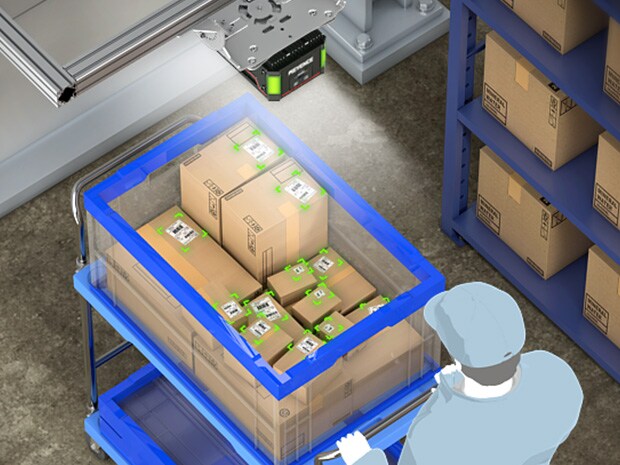 KEYENCE's SR-5000 Series logistics code reader is ideal for realizing this mechanism. With its overwhelming reading range and deep depth of field, it can stably read the codes on cardboard boxes placed randomly or stacked in multiple layers inside the roll cage, regardless of their position or orientation. Its high-speed reading performance improves productivity and eliminates shipping errors without slowing down the work speed. It also contributes to strengthening traceability and achieves operational improvements that dramatically enhance logistics quality.