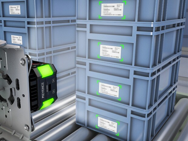 On conveyor lines in distribution warehouses and factories, the task of reading barcodes on stacked returnable boxes or containers one by one is time-consuming and often becomes a productivity bottleneck. This application dramatically improves the efficiency of logistics processes by reading multiple barcodes and 2D codes affixed to the sides of stacked containers transported at high speed with a single code reader all at once.