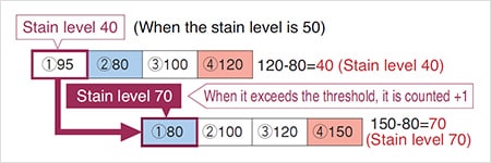 - When the stain level exceeds the present threshold, the standard segment is counted as a stain. The number of times the preset threshold is exceeded in a measured area is called the “Stain Area”. The process repeats to constantly shift the standard segment within the measured area.