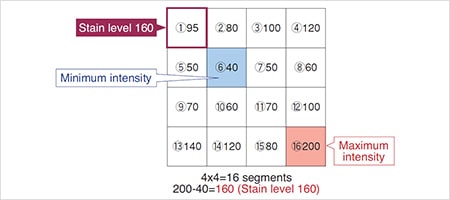 - It determines the difference between maximum and minimum intensities of 4 segments, including a standard segment (① 95 in the figure below). The difference is considered the stain level of a standard segment.