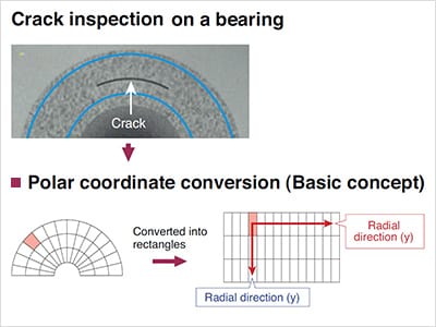 When the CV-X Series is searching a circular area, the program is performing polar coordinate conversion. In order to detect stains, it converts a circular window (inspection segments) into rectangles and compares the segments’ intensities in both circular and radial directions.