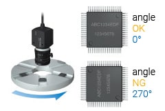 The orientations of ICs on an index table are determined based on the angle detected by the search for the marking on the ICs. This requires processing capability that can keep up with high-speed production lines.