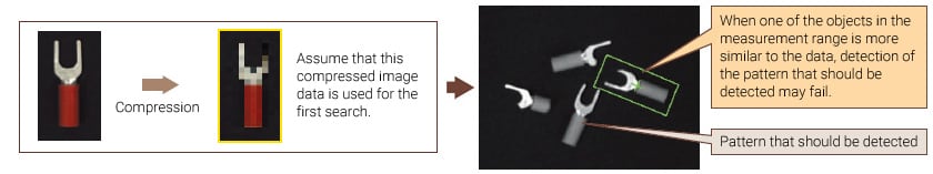 The major cause of search failure is that a pattern that should not be detected (candidate 2 in the figure below) is detected as a candidate in the first search when a compressed image is used.