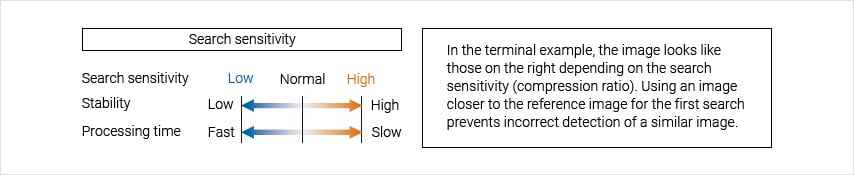 In the terminal example, the image looks like those on the right depending on the search sensitivity (compression ratio). Using an image closer to the reference image for the first search prevents incorrect detection of a similar image.