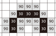 The eye has a value of 30, which is almost black, and the surrounding area has a value of 90, which is brighter than 30. The eye has a value of 30, which is almost black, and the surrounding area has a value of 90, which is brighter than 30.